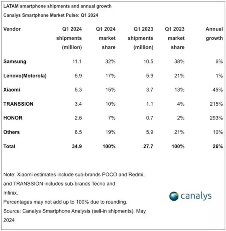 High-End-Geräte sind bei lateinamerikanischen Nutzern nach wie vor weniger beliebt, was sich in den Verkaufszahlen von Samsung und anderen Herstellern widerspiegelt. Gleichzeitig verzeichnen andere Marken wie Xiaomi, Transsion und Honor im Vergleich zum Vorjahr ein deutliches Wachstum bei den Auslieferungen, das zwischen 45 % und 293 % liegt.
