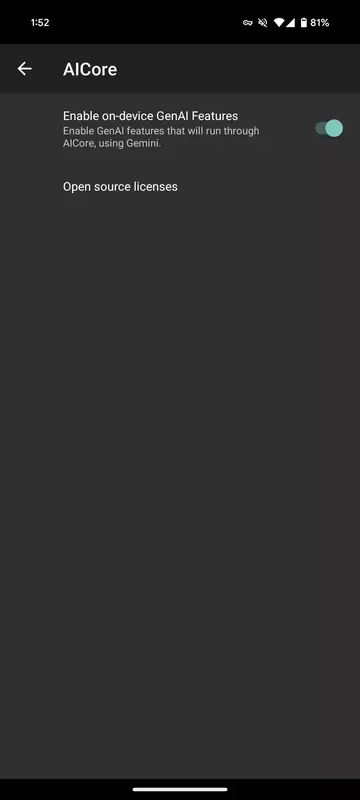 Nach dem Update sind die AICore-Einstellungen in den Entwickleroptionen, Abschnitt Einstellungen, verfügbar. Auf dieser Seite können Sie die GenAl-Funktionen aktivieren, die über AlCore mit Gemini funktionieren werden.