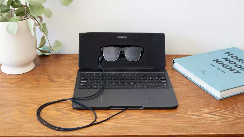 Das Gerät ähnelt äußerlich dem unteren Teil eines normalen Laptops mit einer Tastatur und einem Touchpad, das durch einen Ständer ergänzt wird. Doch anstelle des zweiten Teils, in dem sich normalerweise der Bildschirm befindet, klafft eine Lücke. Für vollwertiges Arbeiten braucht man eine AR-Brille von Xreal, die ein virtuelles 100-Zoll-Display projizieren kann.