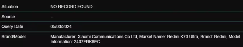 Redmi K70 Ultra in der GSMA IMEI-Datenbank