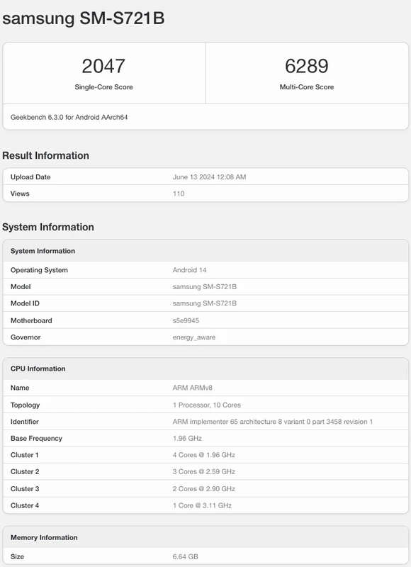 Den Ergebnissen zufolge erreichte das Smartphone mit der Modellnummer SM-S721B, bei dem es sich um die europäische Version des Galaxy S24 FE handeln wird, 2047 Punkte im Single-Core-Leistungstest und 6289 Punkte im Multi-Core-Test. Nach der Beschreibung des Chip-Layouts auf der Testseite zu urteilen, wird das Smartphone mit einem Exynos 2400-Prozessor ausgestattet sein, 8 GB RAM haben und mit Android 14 laufen.
