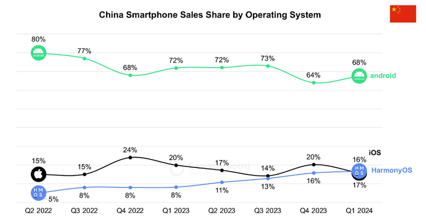 Im ersten Quartal dieses Jahres hat HarmonyOS zum ersten Mal iOS überholt. Sein Anteil beträgt 17 %, das ist 1 % mehr als das mobile Betriebssystem des amerikanischen Unternehmens Apple. Die Popularität von HarmonyOS hat sich im Vergleich zum gleichen Zeitraum des Vorjahres etwa verdoppelt.