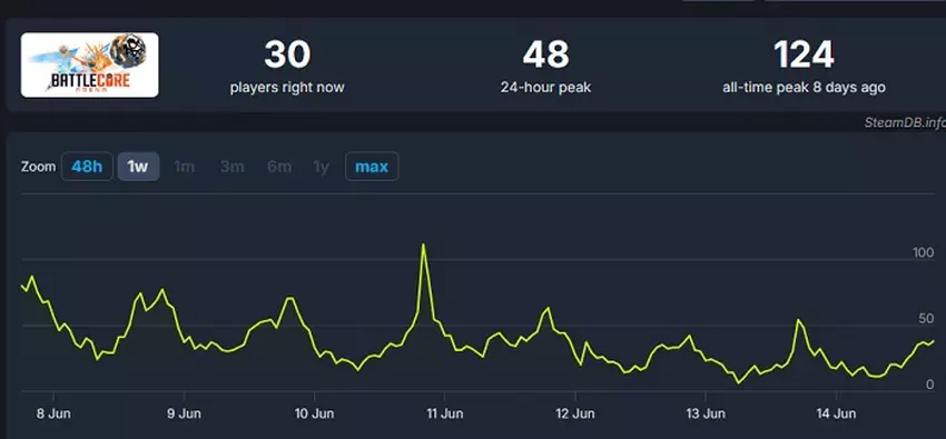 Auf Steam lag der Online-Spitzenwert von Battlecore Arena in dieser Woche bei 124 Personen, wobei das beste Ergebnis in den letzten 24 Stunden bei 48 Personen lag.