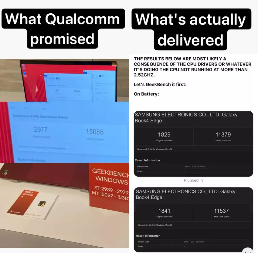 Das wichtigste Tool zur Leistungsbeurteilung, der Geekbench-Benchmark, zeigte Ergebnisse, die deutlich niedriger sind als behauptet. Der Nutzer @lafaiel, der ein Samsung Galaxy Book4 Edge zum Testen erhalten hat, meldete Ergebnisse von 1.829 Punkten im Single-Core-Test und 11.537 Punkten im Multi-Core-Test, die unter den auf Presseveranstaltungen präsentierten Werten liegen - 2.977 bzw. 1.5086 Punkte. Darüber hinaus stellte @lafaiel fest, dass die Single-Core-Leistung sogar niedriger ist als die des iPhone 12 Mini.