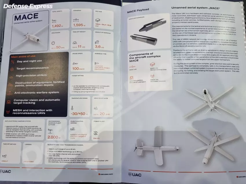 Das ukrainisch-tschechische Unternehmen UAC zeigte am Stand des Nationalen Verbands der ukrainischen Verteidigungsindustrie (NAUDI) eine neue Bulava-Angriffsdrohne, die in der Exportversion Mace heißt.