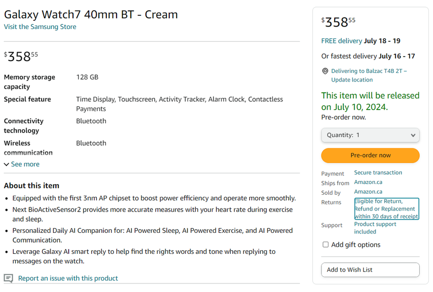 Screenshot der Galaxy Watch7-Seite von Amazon Kanada