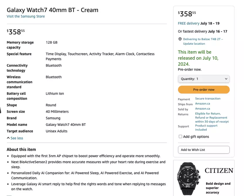 Ein Beitrag auf Amazon Canada enthüllt einige der Spezifikationen und den Preis der Galaxy Watch 7.