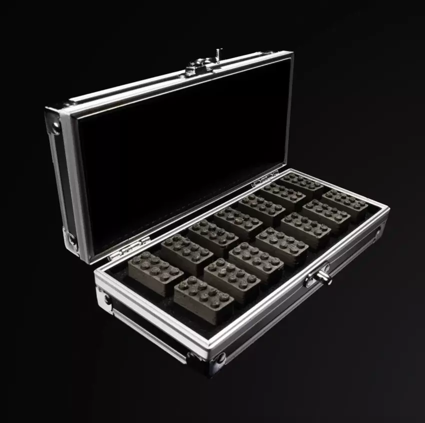 Die Bausteine wurden aus dem Staub eines Meteoriten hergestellt, der bei der ESA recycelt und dann für den 3D-Druck von Lego-Modellen verwendet wurde. Diese neuen Bausteine haben das traditionelle Lego-Aussehen beibehalten, sind aber in einem Weltraumgrau gehalten.