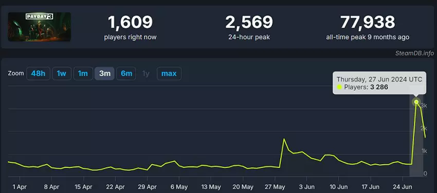Es ist nicht klar, welche der Neuerungen eine Rolle gespielt haben, aber in den letzten 24 Stunden wurde Payday 3 in der Spitze von 3.286 Personen auf Steam gespielt. Diese Zahl ist überhaupt nicht beeindruckend, vor allem im Vergleich zu anderen Spielen, einschließlich Payday 2, aber während Payday 3 zuvor im Durchschnitt etwa 500 Spieler hatte, hat sich diese Zahl mit der Veröffentlichung von Boys in Blue versechsfacht.