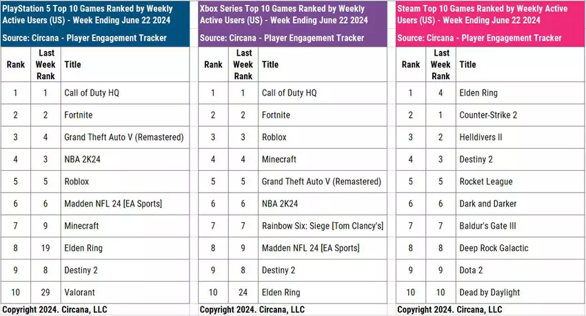 Der Circana-Analyst Mat Piscatella hat Ende Juni eine Liste der beliebtesten Spiele in den USA veröffentlicht. Auf PlayStation und Xbox führen Call of Duty und Fortnite die Liste an, während Elden Ring auf PS und Xbox auf Platz 8 bzw. 10 liegt.