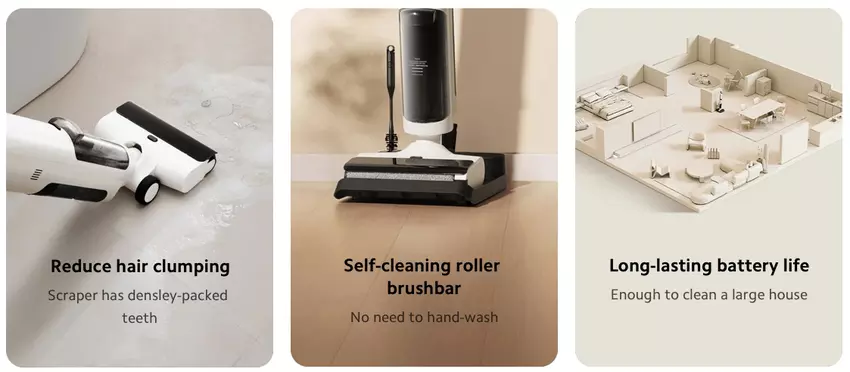 Der Staubsauger hat die Funktion der Nassreinigung erhalten. Das Gerät ist mit einer Bürste ausgestattet, die mit einer Geschwindigkeit von 500 Umdrehungen pro Minute rotiert. Der Xiaomi Truclean W20 Wet Dry Vacuum verfügt über einen Modus, der verhindert, dass sich Haare auf der Bürste kräuseln. Nach der Reinigung kann sich die Neuheit automatisch von Staub befreien.