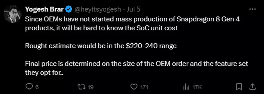 Die nächste Generation von Qualcomms Mobilprozessor, der Snapdragon 8 Gen 4, wird deutlich teurer sein als sein Vorgänger. Laut dem Insider Yogesh Brar könnte der Preis des neuen Chipsets bis zu 240 US-Dollar betragen, was 25-30 % mehr als der Preis des Snapdragon 8 Gen 3 ist.