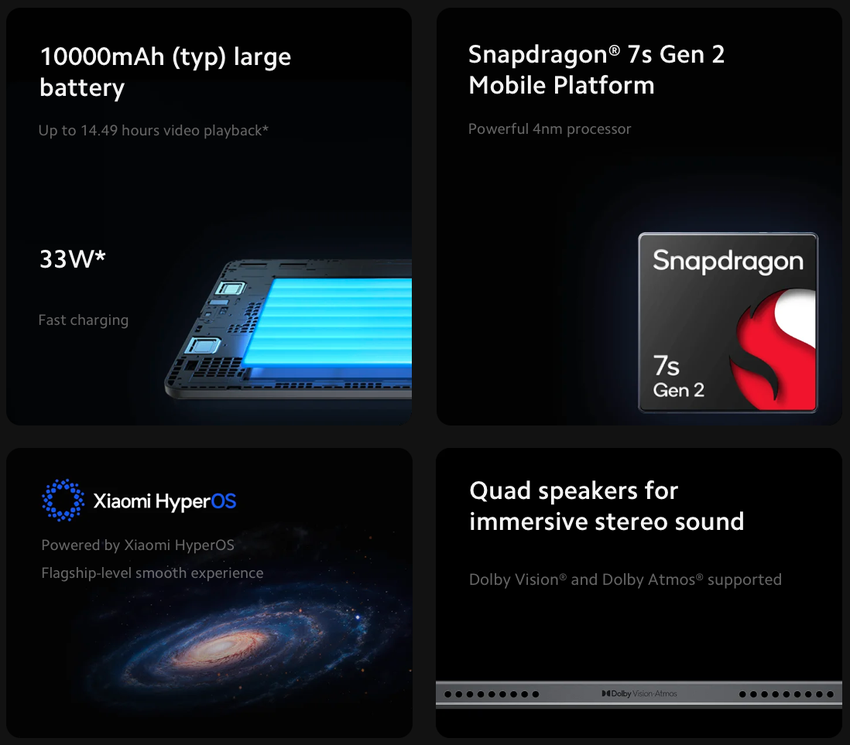 Das Tablet hat ein eingebautes 5G-Modem und einen SIM-Karten-Slot. Die übrigen technischen Daten sind die gleichen wie beim Modell mit Wi-Fi: 12,1-Zoll-Display, LCD-Matrix, 2,5K-Auflösung und 120 Hz Bildwiederholfrequenz, Snapdragon 7s Gen 2-Chip und 10.000-mAh-Akku mit 33 W Ladeleistung. Die Neuheit ist wasserdicht nach IP52, verfügt über vier Lautsprecher, zwei Mikrofone, einen 3,5-mm-Kopfhöreranschluss, Bluetooth 5.2 und zwei Kameras.