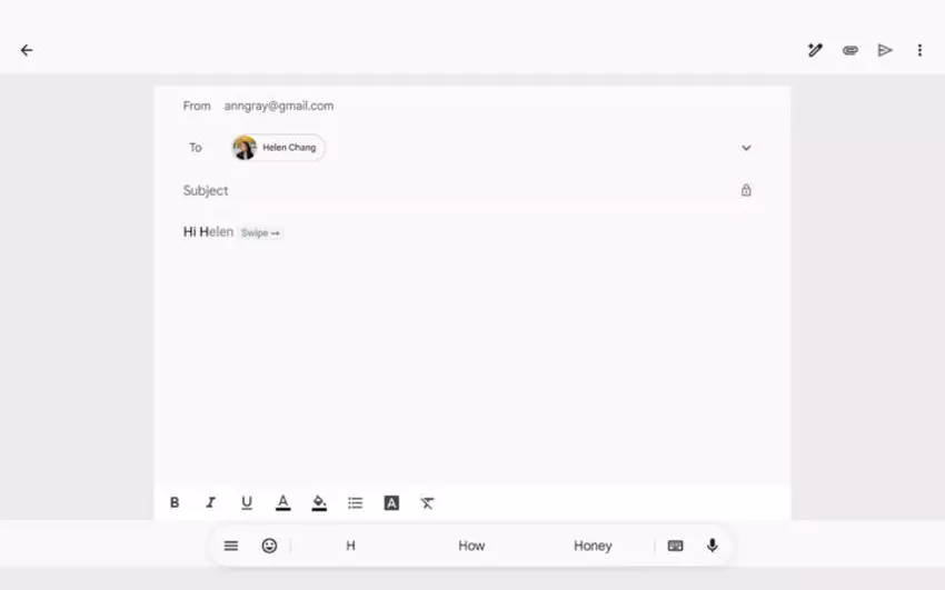 Der Gmail-Bildschirm zum Verfassen von Nachrichten enthält jetzt eine Formatierungsleiste am unteren Rand des Bildschirms, die alle notwendigen Optionen zum Bearbeiten von Text enthält, z. B. zum Ändern der Schriftart und zum Erstellen von Aufzählungslisten.