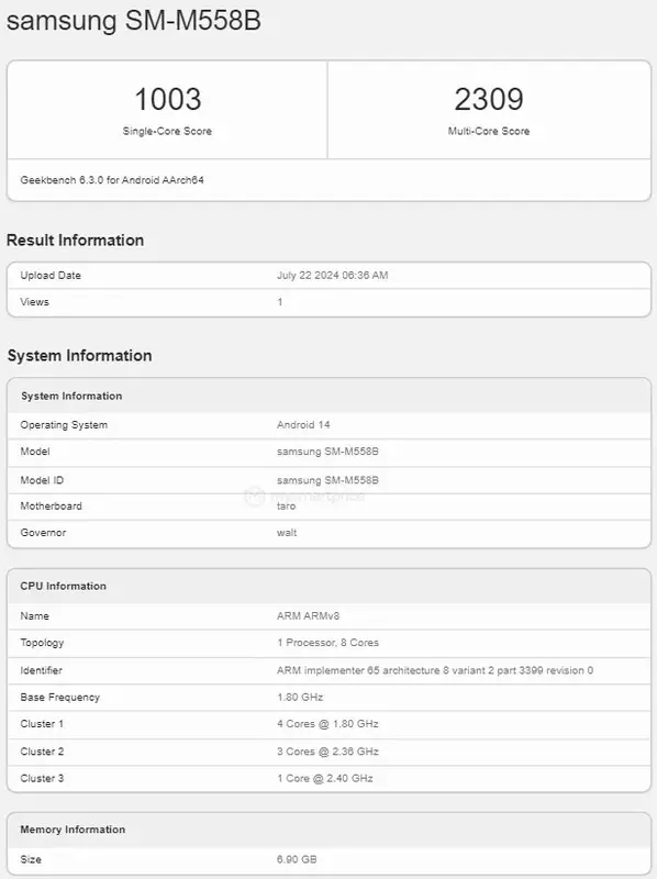 Das Galaxy M55S erzielte 1003 Punkte in den Single-Core-Tests von Geekbench und 2309 Punkte in den Multi-Core-Tests, was auf seine Leistung hindeutet.
