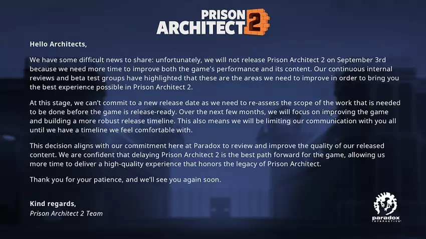 Paradox Interactive hat angekündigt, dass Prison Architect 2 nicht am 3. September erscheinen wird! Interne Tests haben gezeigt, dass das Spiel noch viele technische Mängel aufweist und die Qualität der Inhalte zu wünschen übrig lässt. Die Spieldesigner brauchen mehr Zeit, um das Spiel fertigzustellen, aber wie viel Zeit - das wissen sie noch nicht, daher hat Prison Architect 2 noch kein Veröffentlichungsdatum.