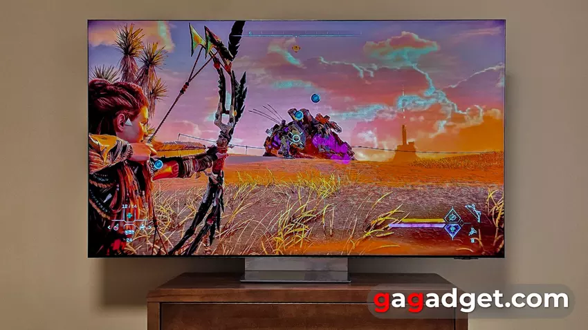 Auf dem großen Bildschirm eines modernen Fernsehers kann man nicht nur Filme oder Serien sehen, sondern auch Spiele genießen. Und hier bietet Ihnen der QN900D-Fernseher alle Funktionen eines Gamer-Monitors, nur auf einem größeren Bildschirm. Der Fernseher erkennt automatisch einen PC- oder Konsolenanschluss und sogar das Spielgenre (auch hier verzichtet er nicht auf lernfähige neuronale Netze). Gut gefallen hat mir auch der 32:9-Seitenverhältnismodus (der nicht bei allen Spielen funktioniert), mit dem man sehen kann, was außerhalb des Standardrahmens bleibt. Und die Möglichkeit, das Zielen direkt im Spiel zu markieren (und die bequemere Option zu wählen). Es handelt sich eigentlich nur um ein paar Fadenkreuze in der Mitte des Bildschirms, aber die Möglichkeit, das, was die Spieleentwickler geschaffen haben, durch etwas Praktischeres zu ersetzen, macht Sinn.