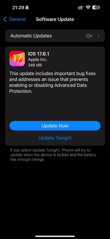 Die Firmware trägt die Nummer iOS 17.6.1 und wiegt rund 350 MB. Das System ist bereits für alle unterstützten iPhone-Modelle verfügbar. Sie können die Verfügbarkeit von OTA in den Einstellungen des Geräts überprüfen.