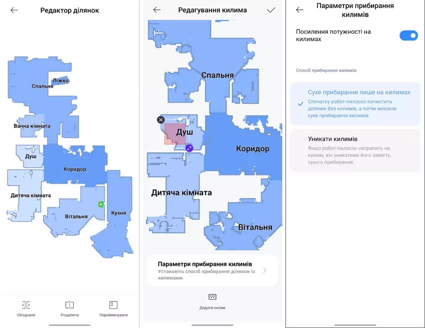 - Es ist gut, dass es eine Einstellung für die Teppichreinigungsparameter gibt. Ich habe, wie gesagt, keine Hochflorteppiche, aber man kann festlegen, wie diese Bereiche behandelt werden sollen - die Schwämme über die Teppiche heben und nur eine Trockenreinigung durchführen oder diese Bereiche ganz vermeiden. Sie können auch die Saugleistung des Roboters auf Teppichen erhöhen, was sinnvoll erscheint.
