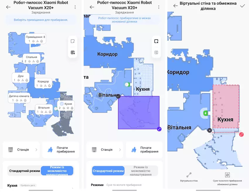 Eine Option, die seit einigen Jahren bei Staubsaugerrobotern verfügbar ist, die mit einer Karte arbeiten können - die Erstellung von virtuellen Wänden und begrenzten Bereichen für die Reinigung. Ich habe nur eine Wand installiert - dort, wo Küche und Loggia getrennte Türen haben, wodurch ein Büro für mich in der Loggia entsteht. Es ist nicht so, dass ich dort nicht putzen müsste, es ist nur so, dass der Roboter an der Türschwelle sowieso nicht vorbeikommt. Aber interessanterweise hat der Xiaomi X20+ trotz des Hindernisses auch diesen Teil der Küche mit seinem Laser so weit wie möglich kartiert.