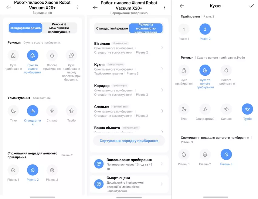 Sehr gut gefallen haben mir die Einstellungen für die Reinigung der einzelnen Räume. Es gibt insgesamt 48 Kombinationen - 4 Reinigungsmodi, 4 Saugstärken und Wasserstände. In der Praxis hat sich gezeigt, dass mir für alle Räume die Standardeinstellungen ausreichen - ich habe nur im Schlafzimmer die doppelte Reinigung und in der Küche die maximale Leistung und die maximale Befeuchtung hinzugefügt (ebenfalls in zwei Durchgängen). Im Allgemeinen war die Reinigung der Küche ein Problem, weil die von mir gewählten Bodenfliesen jeden Tag so schwer zu reinigen waren. Jetzt, dank des Roboters, kann sie einmal pro Woche gereinigt werden, da der Xiaomi X20+ sie ziemlich gut sauber hält. Zwei Besuche pro Tag mit Nassreinigung reichen dafür aus.