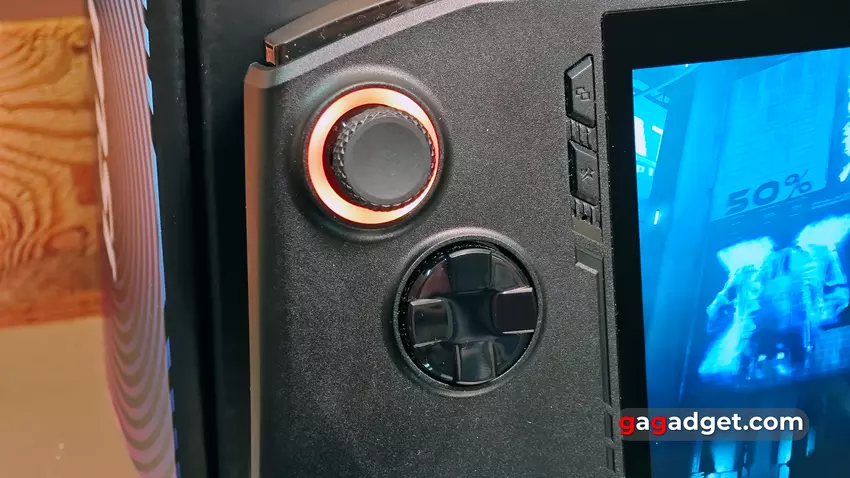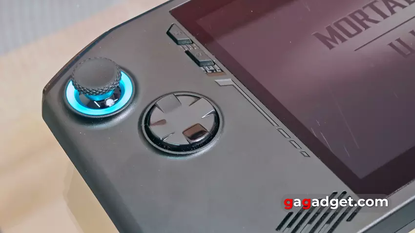 Die ABXY-Tasten haben einen angenehmen, informativen Hub und wackeln praktisch nicht. Im Vergleich zu Konsolen-Gamepads scheinen die Sticks kleiner und leichter zu kippen zu sein, was etwas gewöhnungsbedürftig ist. Einer der großen Pluspunkte des MSI Claw ist die Verwendung von Hall-Sensor-basierten Sticks und Triggern. Anstelle eines physischen Kontakts funktionieren sie dank Magneten und Hall-Sensoren. Dadurch wird die Wahrscheinlichkeit verringert, dass die Sticks ausfallen und abdriften. Die Sticks sind mit einer RGB-Hintergrundbeleuchtung ausgestattet, die über die proprietäre Software angepasst werden kann. Das D-Pad ist solide, die Pfeile sind nicht abgetrennt. Nach DualSense ist das ungewöhnlich, aber es ist gut implementiert und es gibt keine falschen Drücker, was besonders in Kampfspielen wichtig ist.