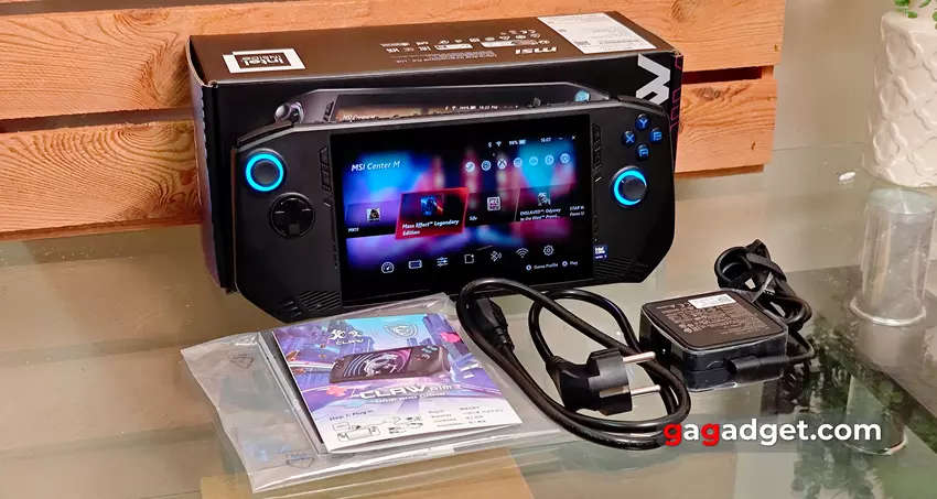 Die MSI Claw-Konsole wird in einer mittelgroßen Schachtel mit vielen bunten Bildern geliefert. Der Lieferumfang ist minimal: die Konsole selbst, ein 65-Watt-Netzteil, ein Netzkabel, eine Schnellstartbroschüre und ein ausführliches Handbuch.