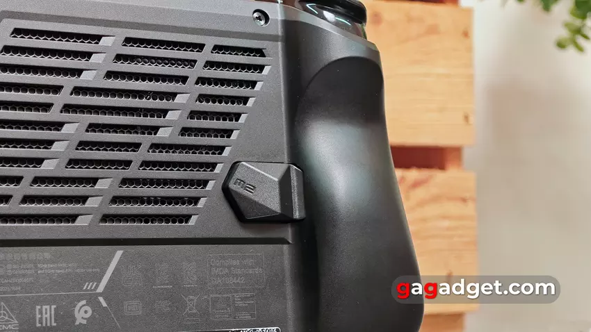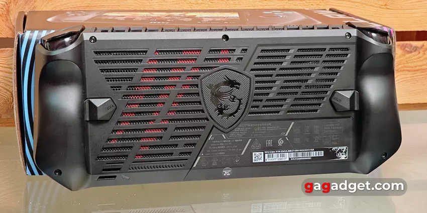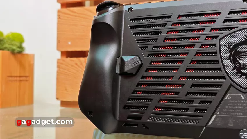 Auf der Rückseite befinden sich viele Lüftungslöcher für die Luftzufuhr durch das Kühlsystem. In der Mitte befindet sich der bekannte MSI-Gaming-Liniendrache, und in der unteren linken Ecke ist ein Platz für die Befestigung einer Schlaufe. Die Rückwand ist mit sechs Schrauben befestigt. In der Mitte unten befindet sich ein Garantiesiegel. Dies deutet darauf hin, dass das Unternehmen eine Selbstdemontage des MSI Claw nicht begrüßt. Das ist angesichts des inneren Aufbaus auch nicht verwunderlich: Der Austausch der SSD ist zwar möglich, aber der Vorgang ist kompliziert. Man muss den Akku und das gesamte Kühlsystem entfernen. Und nach dem Austausch der SSD muss man noch neue Wärmeleitpaste auf den Prozessor auftragen, bevor man das Kühlsystem wieder anbringt.