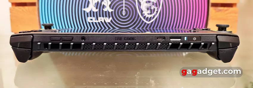 An der oberen Kante des MSI Claw wird fast die gesamte Breite durch den Bereich zum Einblasen der heißen Luft eingenommen, darüber befinden sich weitere Funktionselemente.
