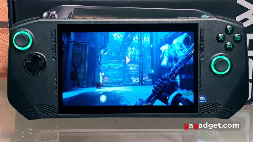 MSI Claw hat ein typisches Design für moderne tragbare Konsolen. In der Mitte des Gehäuses befindet sich ein 7-Zoll-Touchscreen-Display unter Schutzglas und alle wichtigen Bedienelemente an den Seiten. Zwei Analogsticks mit RGB-Beleuchtung um sie herum, ein D-Pad (Pfeil-Pad) auf der rechten Seite und vier Standard-ABXY-Tasten auf der linken Seite. Diese Anordnung hat sich seit Jahrzehnten bewährt und ist ausgewogen und optimal.