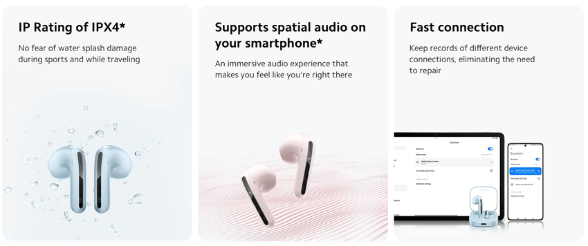 Die Neuheit verfügt über ein duales Mikrofonsystem, einen Audiomodus mit niedriger Latenz, die Google Fast Pair-Funktion und eine Geräuschunterdrückungstechnologie für Störgeräusche bei Anrufen. Die Redmi Buds 6 Active halten mit einer einzigen Aufladung bis zu 30 Stunden (mit Hülle). Aufgeladen wird die Neuheit über den USB-C-Anschluss.