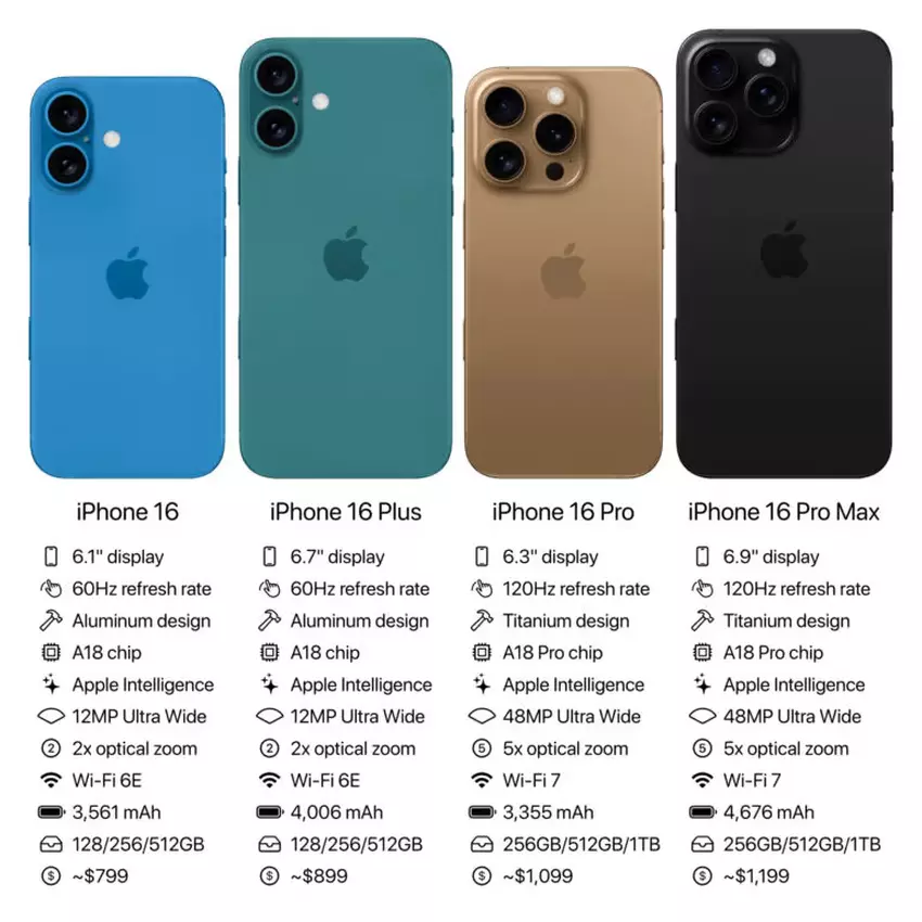 Bei den Modellen iPhone 16 Pro und 16 Pro Max werden die Bildschirme auf 6,3 bzw. 6,9 Zoll vergrößert und erhalten eine Bildwiederholfrequenz von 120 Hz. Sie verfügen über den A18 Pro Chipsatz, ein Titangehäuse, Wi-Fi 7 Unterstützung, eine 48-Megapixel-Ultraweitwinkelkamera und Unterstützung für 5-fachen optischen Zoom. Die Akkukapazitäten werden 3355 mAh und 4676 mAh betragen. Alle bekannten Spezifikationen des neuen Lineups sind in der Abbildung unten zu sehen.