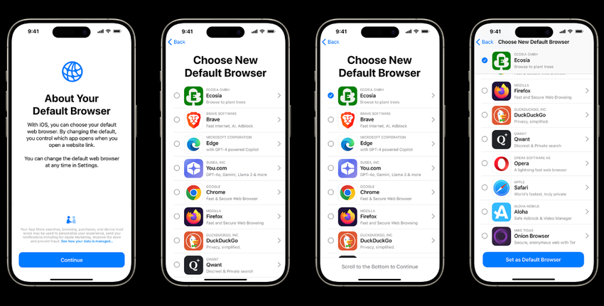 Die Nutzer werden auch in der Lage sein, weitere eingebaute Apps zu entfernen, darunter App Store, Nachrichten, Kamera, Fotos und Safari. Die einzigen Ausnahmen sind die Apps Einstellungen und Telefon. Allen Nutzern, die Safari standardmäßig installiert haben, wird ein aktualisierter Browser-Auswahlbildschirm mit zusätzlichen Informationen zu Drittanbieter-Browsern angezeigt.