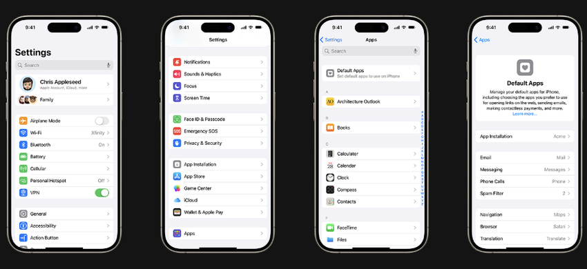 In iOS 18 und iPadOS 18 werden iPhone- und iPad-Nutzer in der EU in der Lage sein, Standard-Apps von Drittanbietern für Anrufe, Nachrichten, Passwortverwaltung, Tastaturen und Spamfilter zu installieren. Diese Änderungen werden in den Einstellungen unter "Standard-Apps" angezeigt.