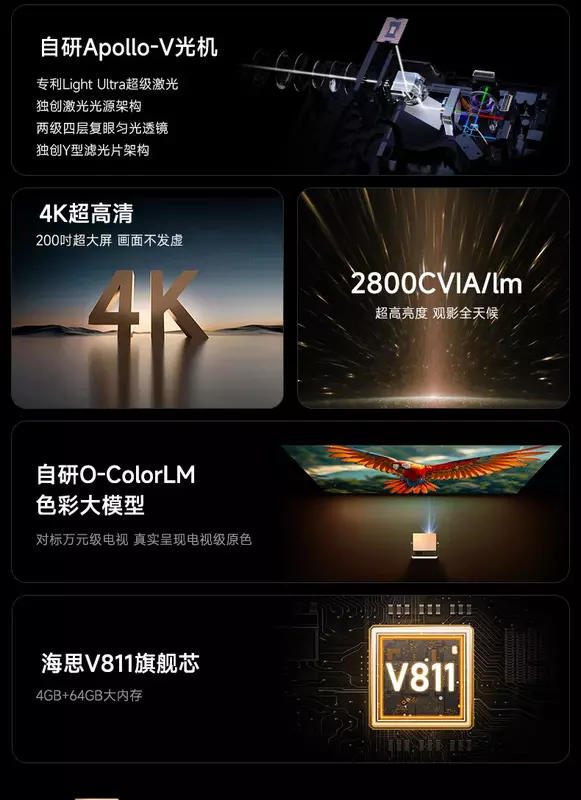 Der Projektor ist mit einem HiSilicon V811-Prozessor, 4 GB RAM und 64 GB internem Speicher ausgestattet und unterstützt HDMI 2.1 und eine Bildwiederholfrequenz von 120 Hz. Das Audiosystem umfasst zwei 10-W-Lautsprecher und eine 600-cm³-Soundkammer, die für einen hochwertigen Klang sorgen. Das Gerät ist in einem schlanken Metallgehäuse mit dynamischer 360°-Aufhängung für eine flexible Anpassung des Projektionswinkels untergebracht. Weitere Funktionen sind die automatische Trapezkorrektur, die Nivellierung des Bildschirms und die intelligente Steuerung über das Smartphone.