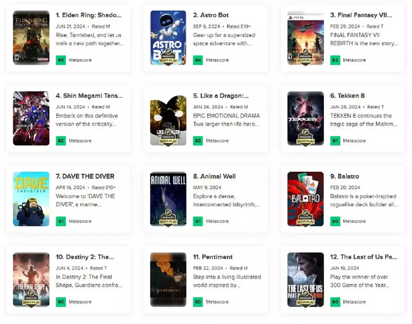 Tatsächlich ist das am höchsten bewertete Projekt des Jahres 2024 die Erweiterung Shadow of the Erdtree für Elden Ring, die eine Punktzahl von 95 erhielt. Da es sich aber um einen DLC und nicht um ein eigenständiges Spiel handelt, geht der Spitzenplatz an Astro Bot, und sein nächster Konkurrent ist ein anderes PS5-Exklusivspiel - Final Fantasy VII Rebirth mit 92 Punkten.