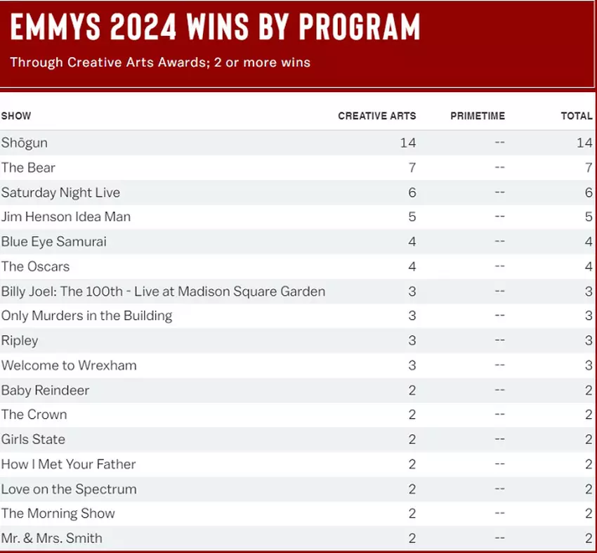 Die Academy of Television Arts and Sciences ermittelte die Gewinner in verschiedenen Kategorien, und die Creative Arts Emmy triumphierende historische Dramaserie Shōgun gewann 14 Auszeichnungen, darunter Beste Leistung einer Episode (Nestor Carbonell), Bester Plot. Bestes Casting, Beste Stuntarbeit, Bester Ton, Bester Schnitt, Beste Kameraführung, Beste Art Direction, Bestes Kostüm und Make-up.