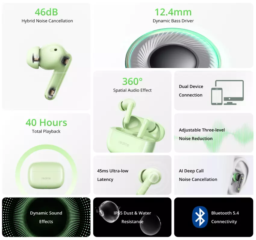Das Modell heißt realme Buds N1. Die Kopfhörer erhielten ein In-Canal-Design, IP55-Schutz gegen Wassertropfen und Schweiß und 12,4 mm Treiber. Das Gerät verfügt über eine Geräuschunterdrückung (ANC) sowie einen 360-Grad-Klangmodus (Spatial Audio). Der Kopfhörer lässt sich über Bluetooth 5.4 mit einem Smartphone und anderen Geräten verbinden. Die Neuheit unterstützt Dual-Device-Konnektivität. Die Autonomie beträgt bis zu 9 Stunden (ohne ANC). Mit einem Ladegerät kann diese Zeit auf 40 Stunden erhöht werden.