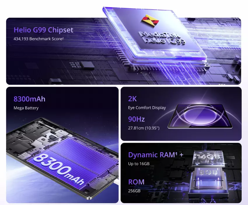 Das Modell verfügt über ein 10,5-Zoll-LCD-Display mit einer Bildwiederholfrequenz von 90 Hz und einer Spitzenhelligkeit von 450 nits. Das Gerät wird von einem 8300-mAh-Akku mit 15 W Ladeleistung angetrieben. Das realme Pad 2 Lite wird von einem Octa-Core MediaTek Helio G99-Prozessor angetrieben, der mit 4/8 GB RAM (LPDDR4X) und 128 GB Speicher gepaart ist. Der eingebaute Speicher kann bei Bedarf mit einer microSD-Karte erweitert werden.