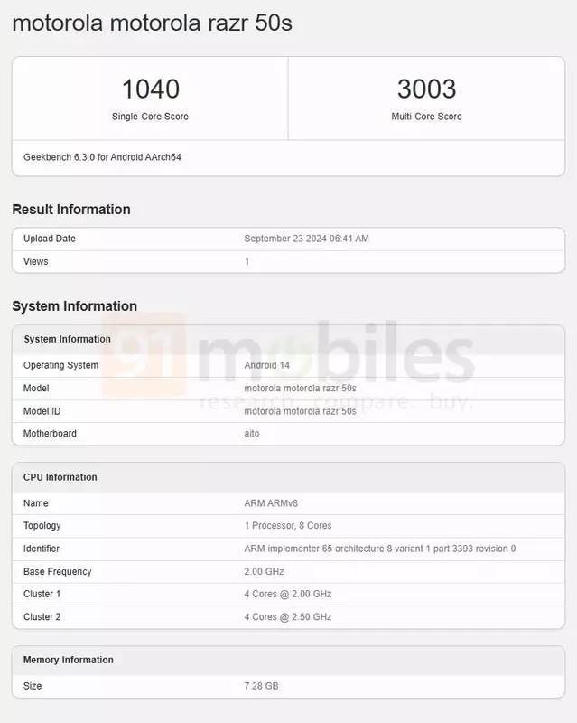 Das Modell erschien vor kurzem in Geekbench, wo angegeben wurde, dass das Razr 50s mit einem Chipsatz mit einer Basisfrequenz von 2,00 GHz und einer Architektur von 4 + 4 Kernen sowie 8 GB RAM ausgestattet ist. Das Gerät erreichte 1.040 Punkte in den Single-Core-Tests und 3.003 Punkte in den Multi-Core-Tests. Dies zeigt, dass die Leistung des Razr 50s genauso gut ist wie die des Razr 50. Das Smartphone wird mit Android 14 laufen und HDR10+ unterstützen.