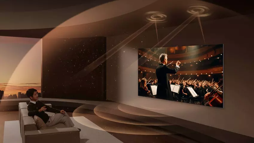 Für den Klang des Fernsehers ist das Audiosystem verantwortlich, das 5 Zwei-Wege-Lautsprecher aus Karbonfaser, 2 Hochtöner mit Naturseidenkalotte und 2 passive Radiatoren umfasst.