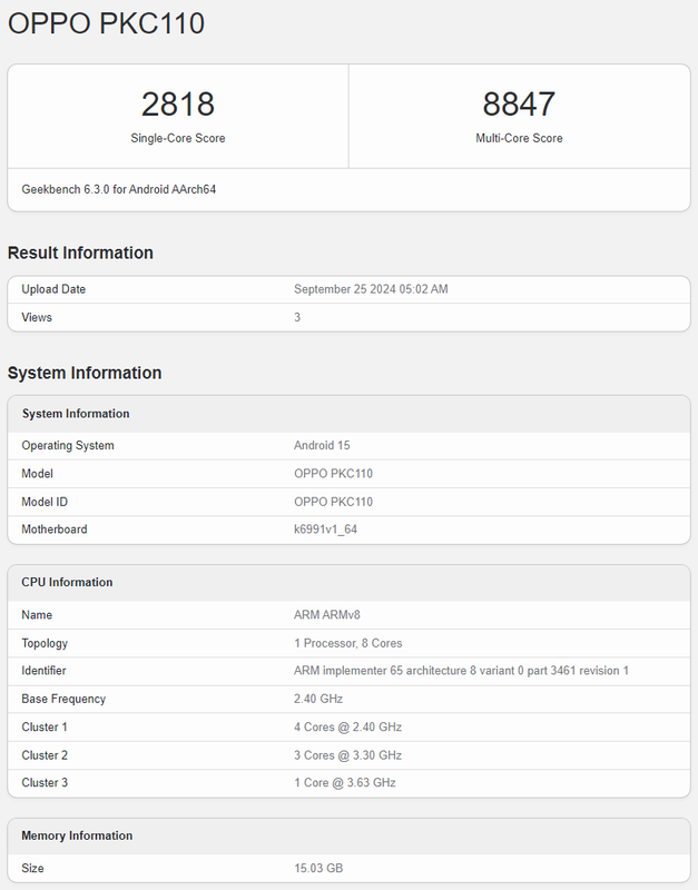 Den Geekbench-Ergebnissen zufolge wird das Smartphone von einem leistungsstarken MediaTek Dimensity 9400-Chip angetrieben, der den Tests zufolge eine Basisfrequenz von 2,40 GHz und eine maximale Frequenz von 3,63 GHz hat. In den Geekbench-Tests erreichte das Find X8 Pro 2.818 Punkte im Single-Core-Test und 8.847 Punkte im Multi-Core-Test. Dies ist etwas niedriger als die Ergebnisse von Snapdragon 8 Gen 4-basierten Geräten wie dem Galaxy S25 Ultra und OnePlus 13.