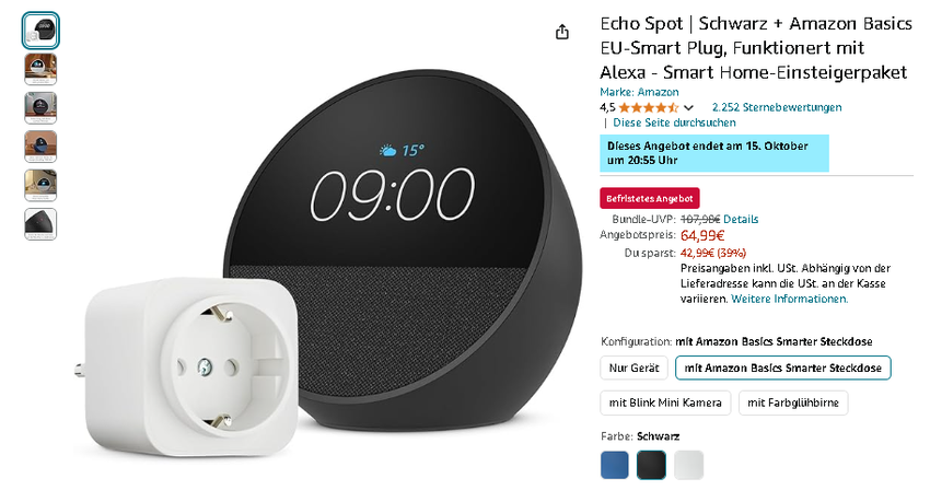 Mit seinem attraktiven Preis, der Vielseitigkeit und dem Potenzial, Ihr Zuhause in eine smarte Oase zu verwandeln, ist dieses Echo Spot Bundle ein Muss für jeden, der sein Leben ein bisschen einfacher und viel cooler gestalten möchte. Aber Achtung: Dieses Angebot könnte schneller verschwinden als Ihre Motivation, am Montagmorgen aufzustehen. Also, greifen Sie zu, bevor es zu spät ist!