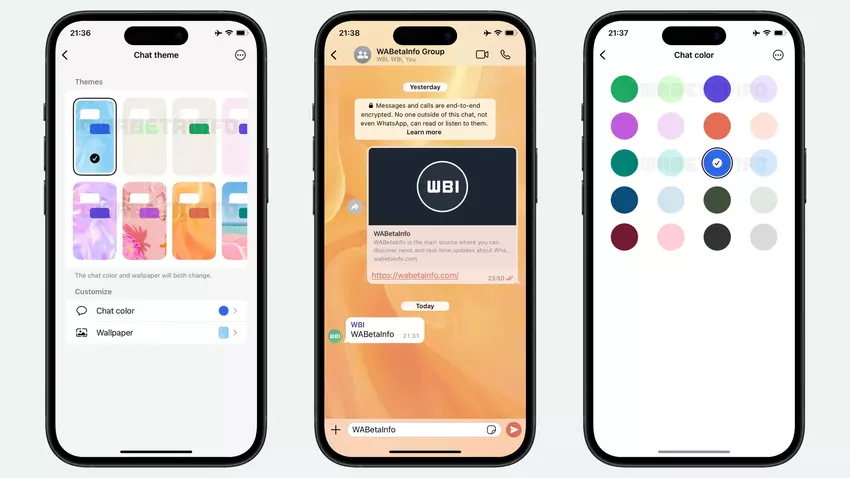 Nutzer können jetzt aus 22 verschiedenen Themen und 20 Farben ein Chat-Design auswählen. Im Chat-Infobereich kann man eine Farbe einstellen und WhatsApp wählt dann automatisch das passende Hintergrundbild aus. Die Nutzer können das Hintergrundbild auch manuell ändern, um jedem Chat ein einzigartiges Aussehen zu verleihen.