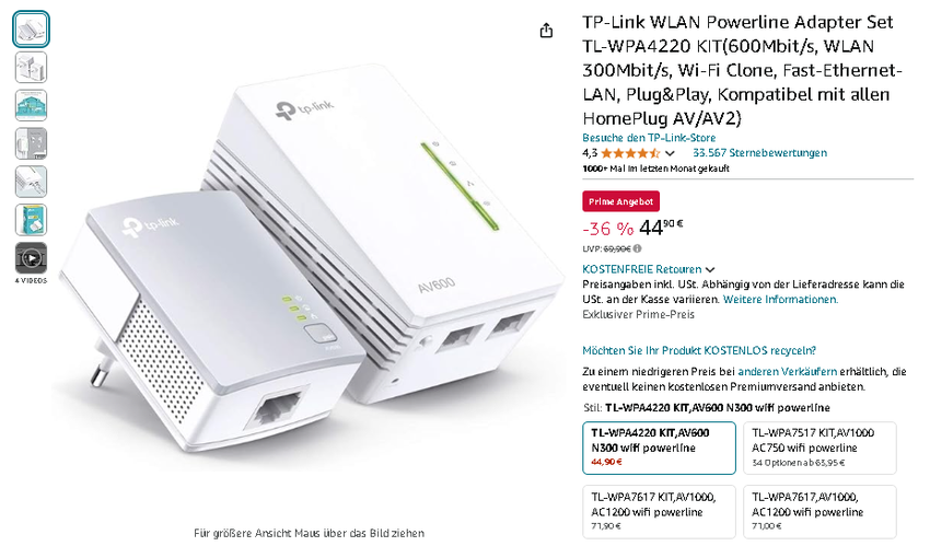 Mit seiner einfachen Einrichtung, der beeindruckenden Leistung und dem aktuellen Sparpreis ist das TP-Link WLAN Powerline Adapter Set TL-WPA4220 KIT die Lösung für alle, die ihr Heimnetzwerk optimieren möchten. Dieses Angebot ist zeitlich begrenzt - sichern Sie sich jetzt Ihren persönlichen Internet-Booster, bevor der Preis wieder steigt!