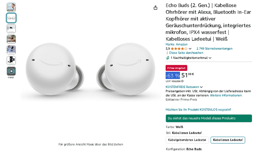 Die Echo Buds (2. Gen.) sind jetzt für nur 51,99 € erhältlich, reduziert von 139,99 € - das sind unglaubliche 63% Rabatt! Ein Angebot, das die Aufmerksamkeit jedes Audiophilen verdient.
