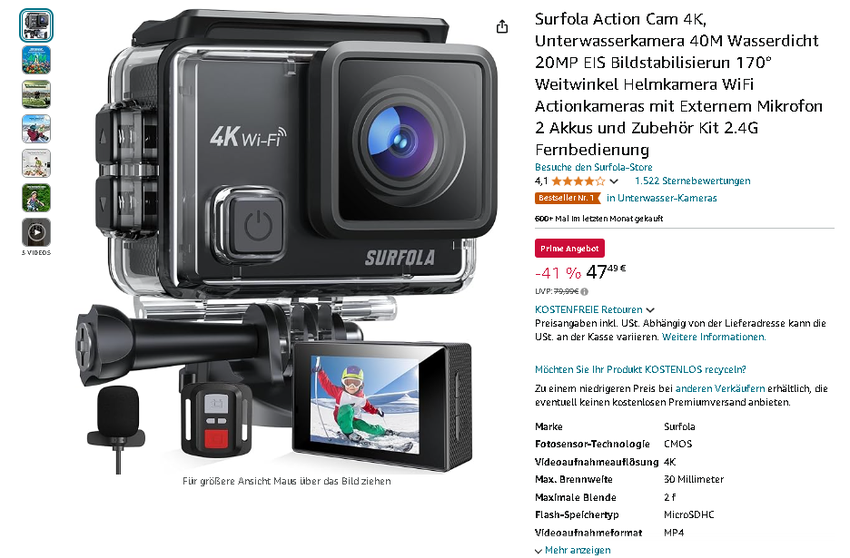 Die Surfola Action Cam 4K ist momentan für nur 47,49 € erhältlich, reduziert von 79,99 € - das sind satte 41% Rabatt! Ein Angebot, das Ihre Abenteuerlust wecken wird.