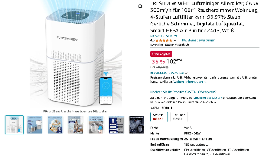 Der FRESHDEW Wi-Fi Luftreiniger ist aktuell für nur 102,02 € erhältlich, reduziert von 159,99 € - das entspricht einer Ersparnis von 36%! Ein Angebot, das Ihnen buchstäblich den Atem rauben wird – um ihn Ihnen gleich wieder zurückzugeben, nur diesmal frischer und reiner.