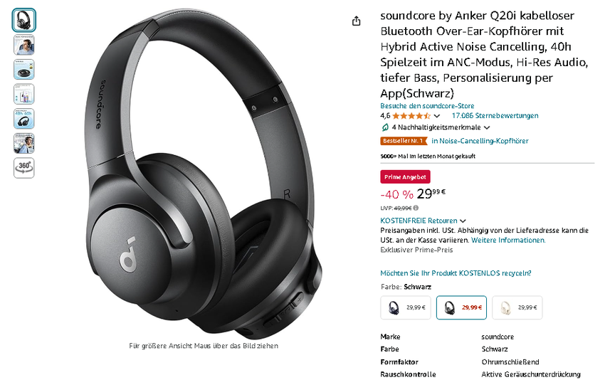 Die soundcore by Anker Q20i Kopfhörer sind aktuell für 29,99 € erhältlich, reduziert von 49,99 € - das entspricht einem sensationellen Rabatt von 40%! Ein Preis, der diese High-Tech-Klangwunder in greifbare Nähe rückt.