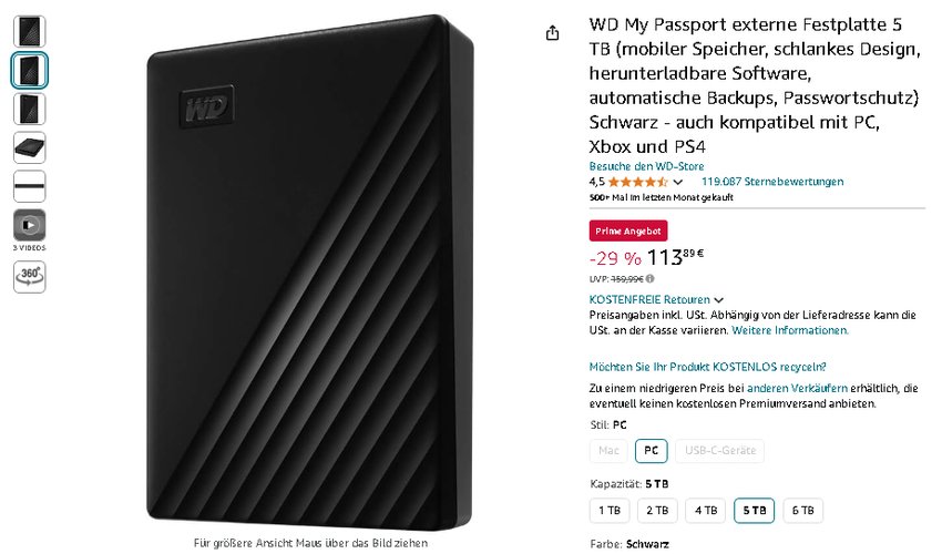 Die WD My Passport 5 TB externe Festplatte ist jetzt für 113,89 € erhältlich, reduziert von 159,99 € - das sind satte 29% Rabatt! Ein Angebot, das Ihre digitale Welt revolutionieren wird.